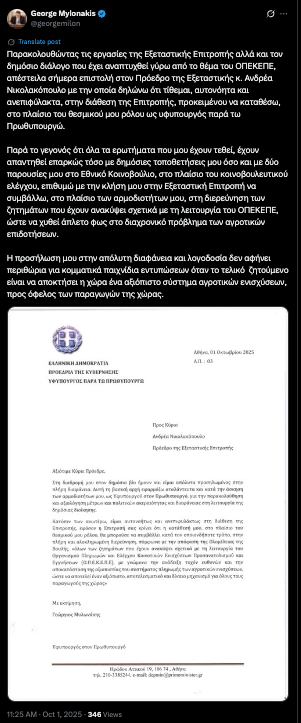 Σε ανάρτησή του στα social media με την οποία δημοσιοποιεί και την επιστολή προς τον Πρόεδρο της Εξεταστικής Επιτροπής για τον ΟΠΕΚΕΠΕ, ο Γιώργος Μυλωνάκης αναφέρει: