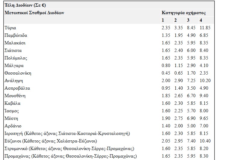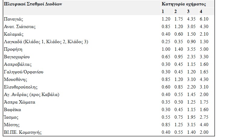 Αναλυτικά, οι τιμές ανά μετωπικό και πλευρικό σταθμό διοδίων θα διαμορφωθούν ως εξής: