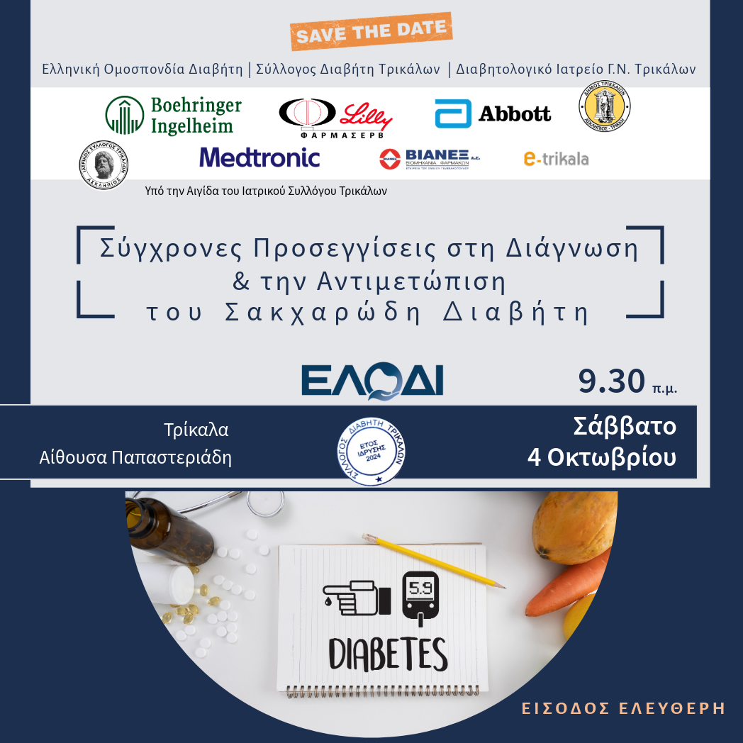 Η Ελληνική Ομοσπονδία Διαβήτη, ο Σύλλογος Διαβήτη Τρικάλων και το Διαβητολογικό Ιατρείο Τρικάλων διοργανώνουν ημερίδα ενημέρωσης και ευαισθητοποίησης πολιτών με θέμα «Σύγχρονες προσεγγίσεις στη διάγνωση και αντιμετώπιση του σακχαρώδη διαβήτη».