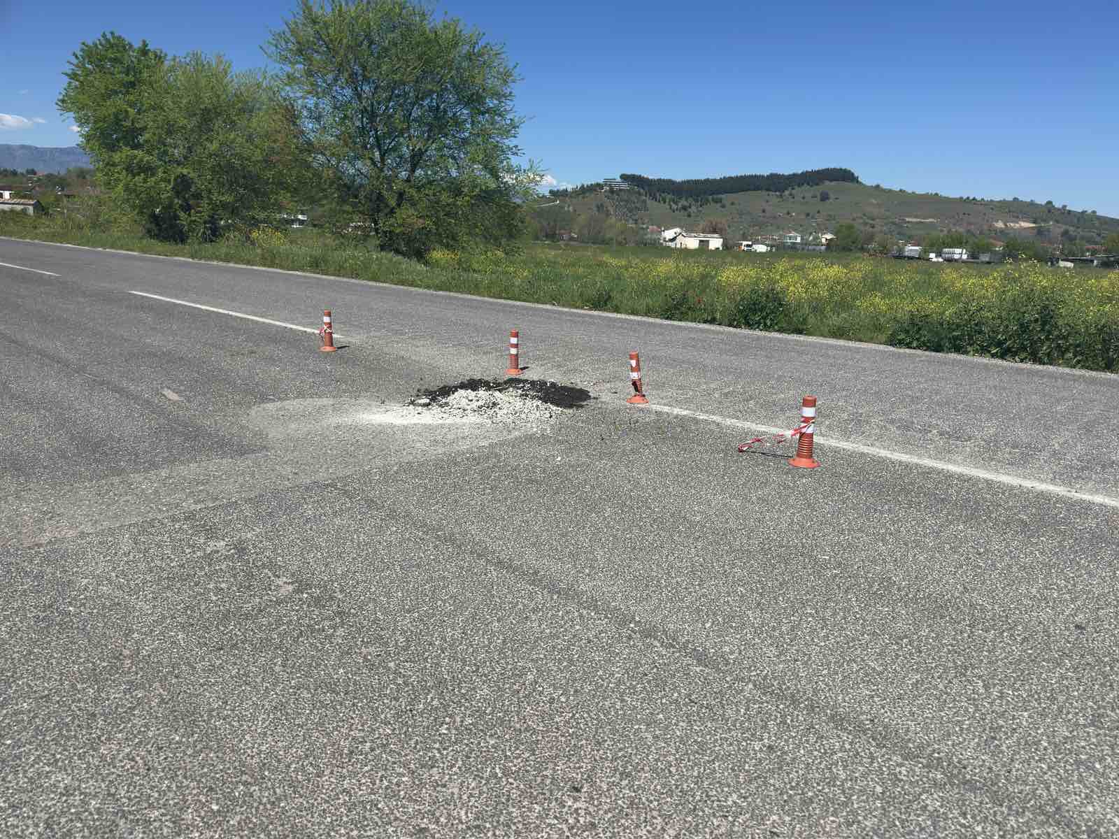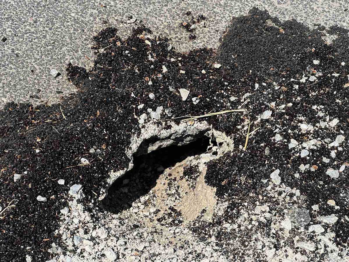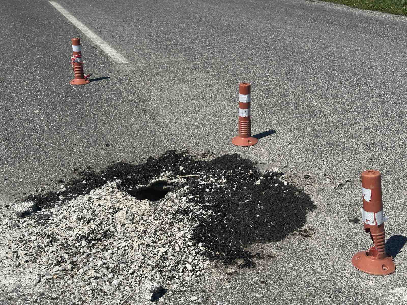 Η «επισκευή» περιορίστηκε σε μια στρώση πίσσας και χαλικιού, η οποία δεν άντεξε ούτε τα βασικά. Το αποτέλεσμα είναι μια ανοιχτή τρύπα, περιτριγυρισμένη από κολονάκια, που μετατρέπει μια ευθεία σε σημείο αναγκαστικών ελιγμών.
