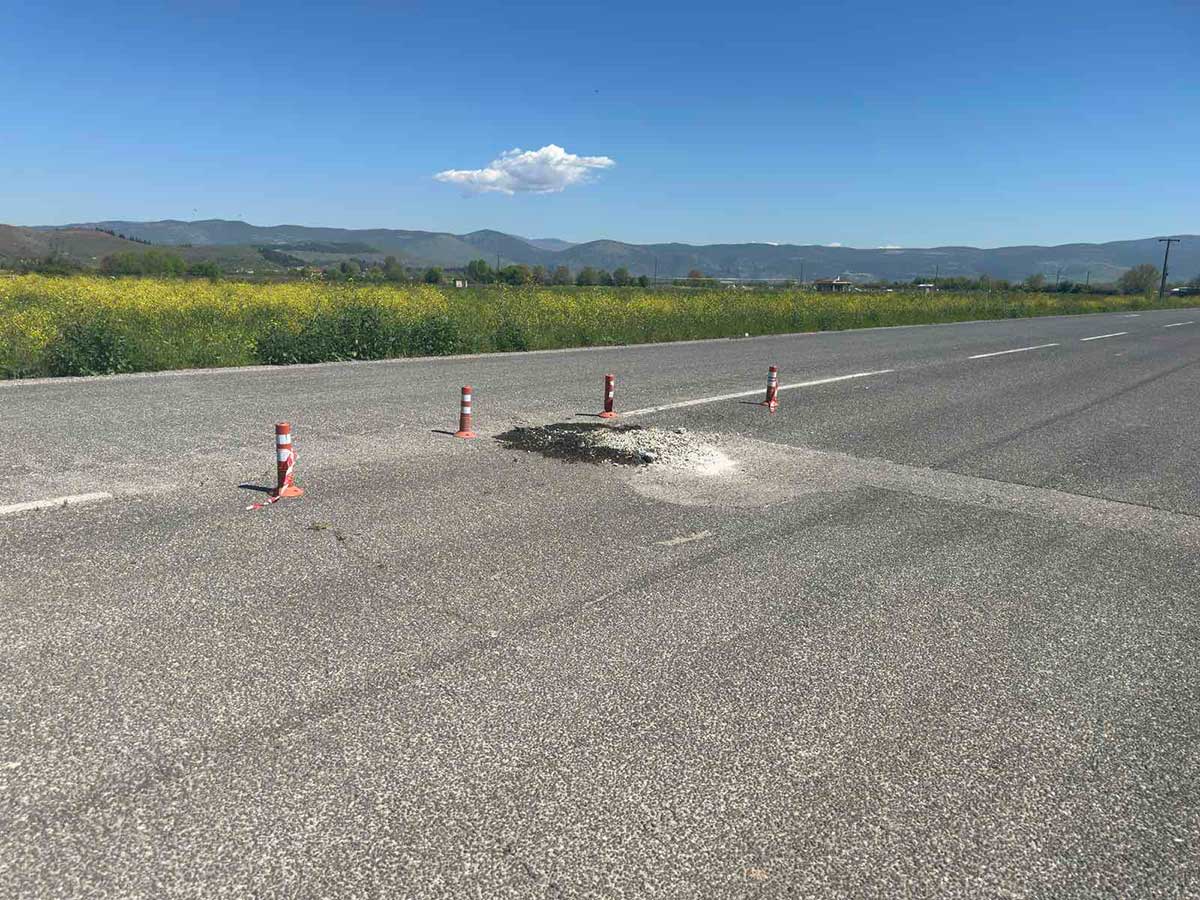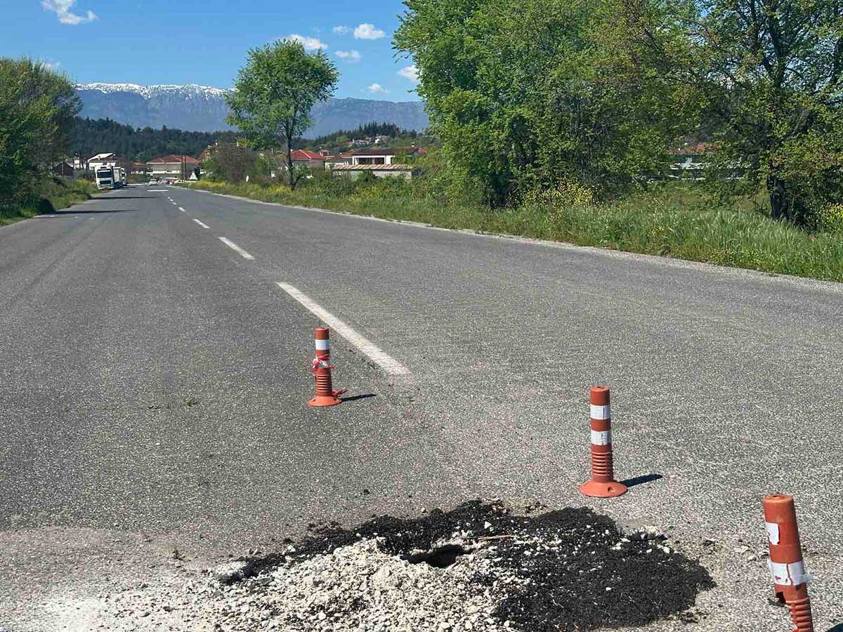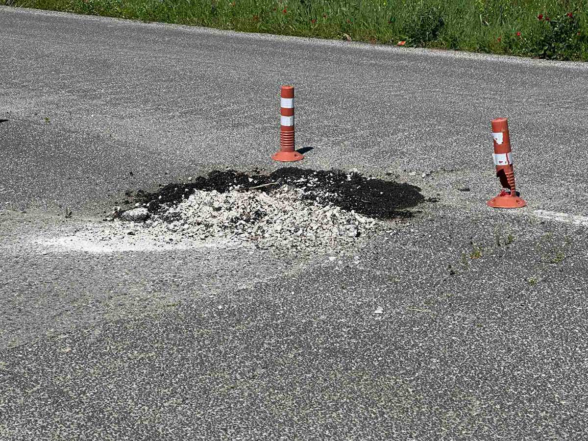 Η «επισκευή» περιορίστηκε σε μια στρώση πίσσας και χαλικιού, η οποία δεν άντεξε ούτε τα βασικά. Το αποτέλεσμα είναι μια ανοιχτή τρύπα, περιτριγυρισμένη από κολονάκια, που μετατρέπει μια ευθεία σε σημείο αναγκαστικών ελιγμών.