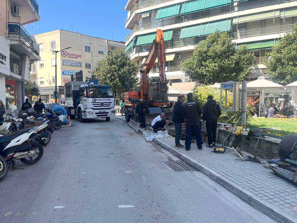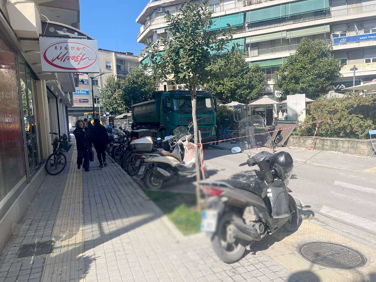 Ο φακός του TrikalaNews.gr κατέγραψε τα συνεργεία επί το έργον, με τα μηχανήματα να έχουν πιάσει θέση στο πεζοδρόμιο και τους περαστικούς να περνούν προσεκτικά δίπλα από τις εργασίες.